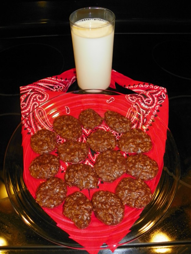Melt in boiler 1/2 Cup Butter or margarine and add 1/2 Cup Milk. Stir in 2 Cups sugar and 2 Tablespoons Cocoa. Stir well, turn heat to low or medium low; cook until it starts to boil. Stir it constantly as it boils. BOIL A FULL 2 MINUTES. REMOVE FROM STOVE. Now add 1/2 Cup Peanut Butter stirring well and then add 2 Cups rolled Oats. Stir until really well mixed. Add 1 Teaspoon Vanilla…stir.