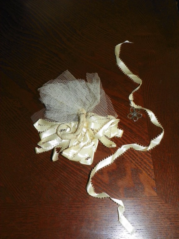 This is a corsage and ribbon from my Mother and Fathers Wedding. The satin ribbon is from her bouquet that included a Bible and the ribbon cascaded down. I only know this because I remember her smiling as she told me about it.