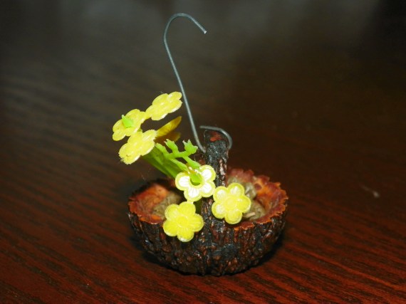 This is a nut..a walnut (I think)…that my grandfather cut and carved into a basket complete with little artificial flowers. The flowers looked better when he made them many years ago. I remember hanging it on our Christmas tree when I was growing up.