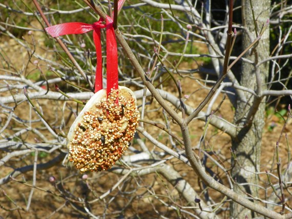 When I went to visit my friend the other day at the assisted living facility I saw that the residents had made bird feeders out of bagels, peanut butter and birdseed.