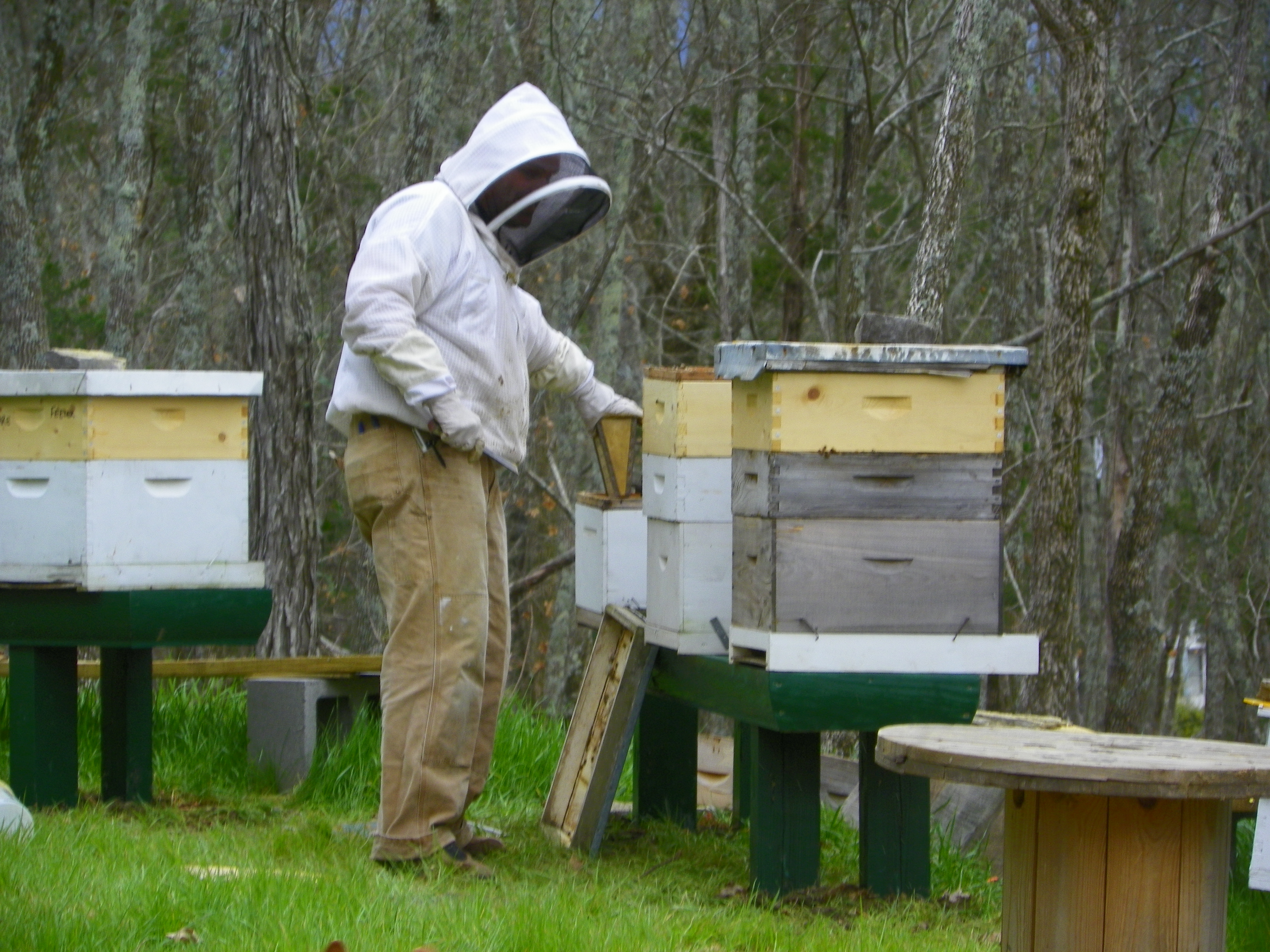 We have a friend who is keeping his hives on the land. About a month ago he was here….working them. I do not know much about bees. He told me he would be glad to let me suit up and he would let me get right in the middle of it. I’m not that brave yet.