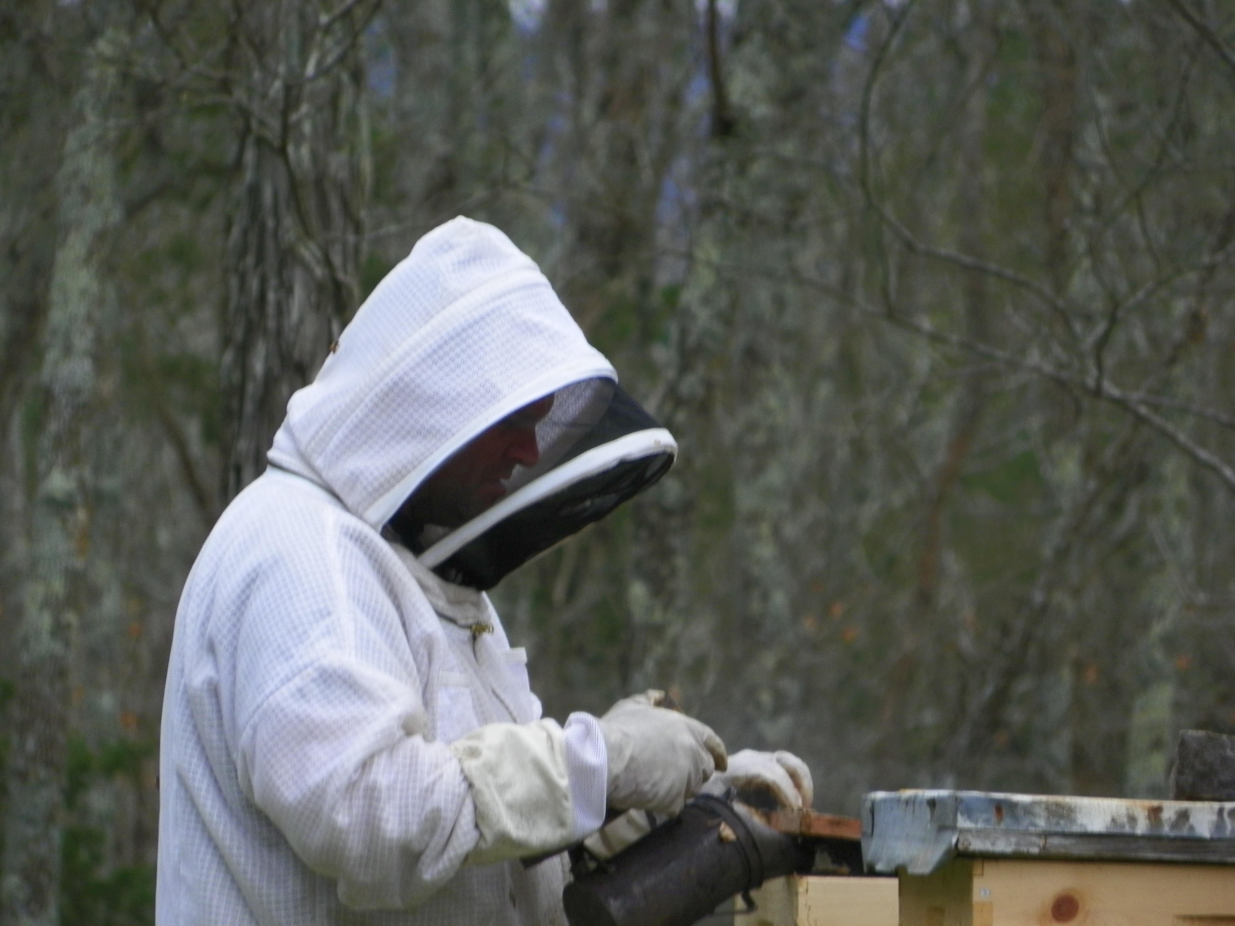 Here he is using it….I wanted pictures…so Billy volunteered to get closer for me. Years ago Billy had some hives…before I came along. That is why he volunteered, he isn’t scared.