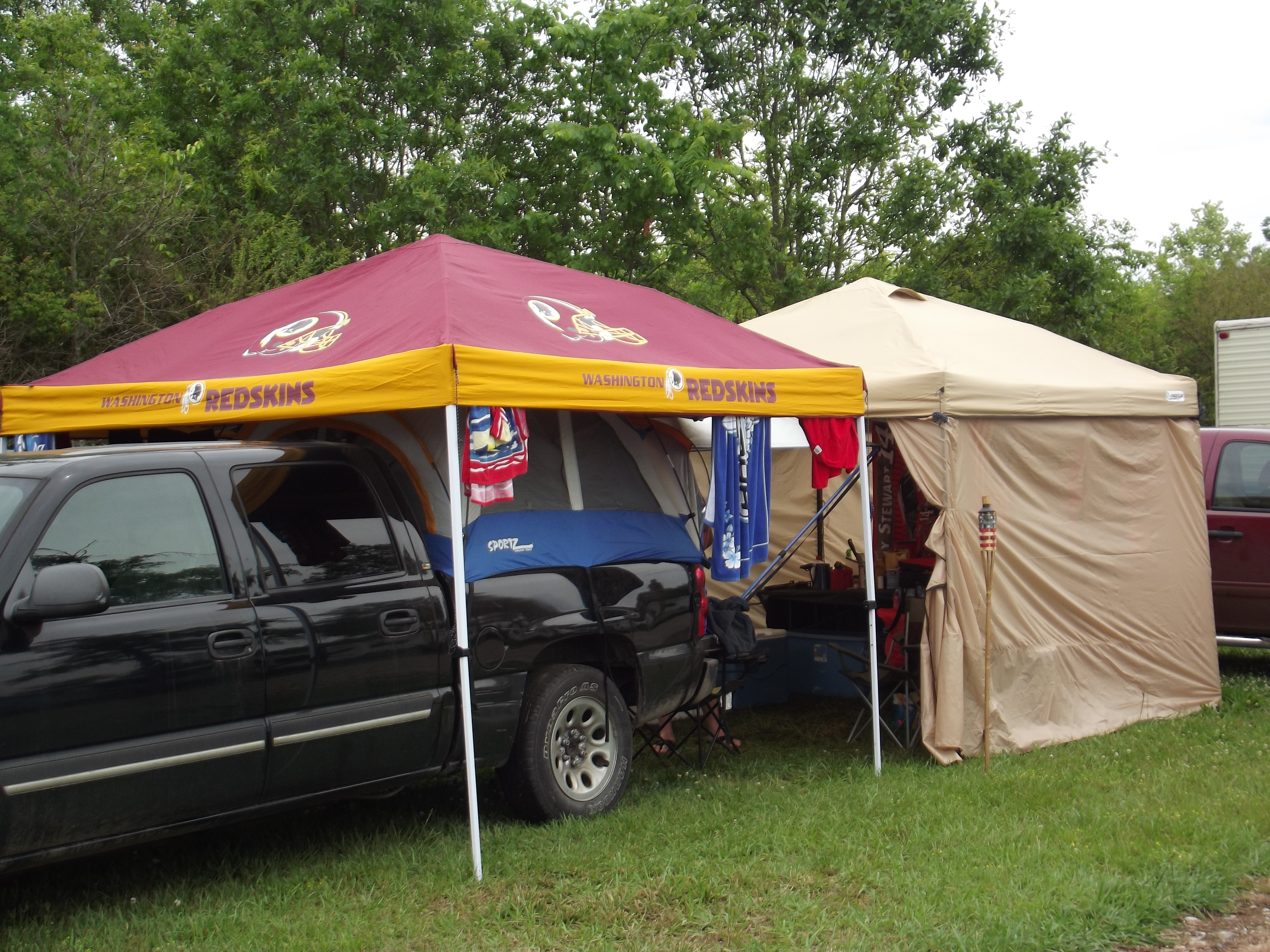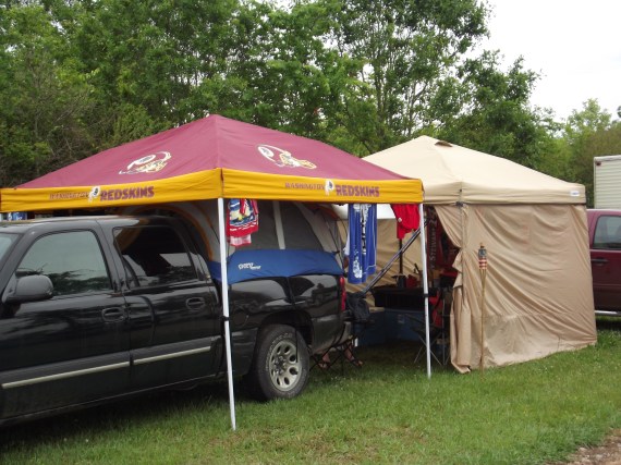 I think this is pretty creative. A tent in the back of a truck, under another canopy in case it rains…which it did. Later the truck was moved and chairs were under the canopy, providing much needed shade. The other little tent was a kitchen….pretty cool.