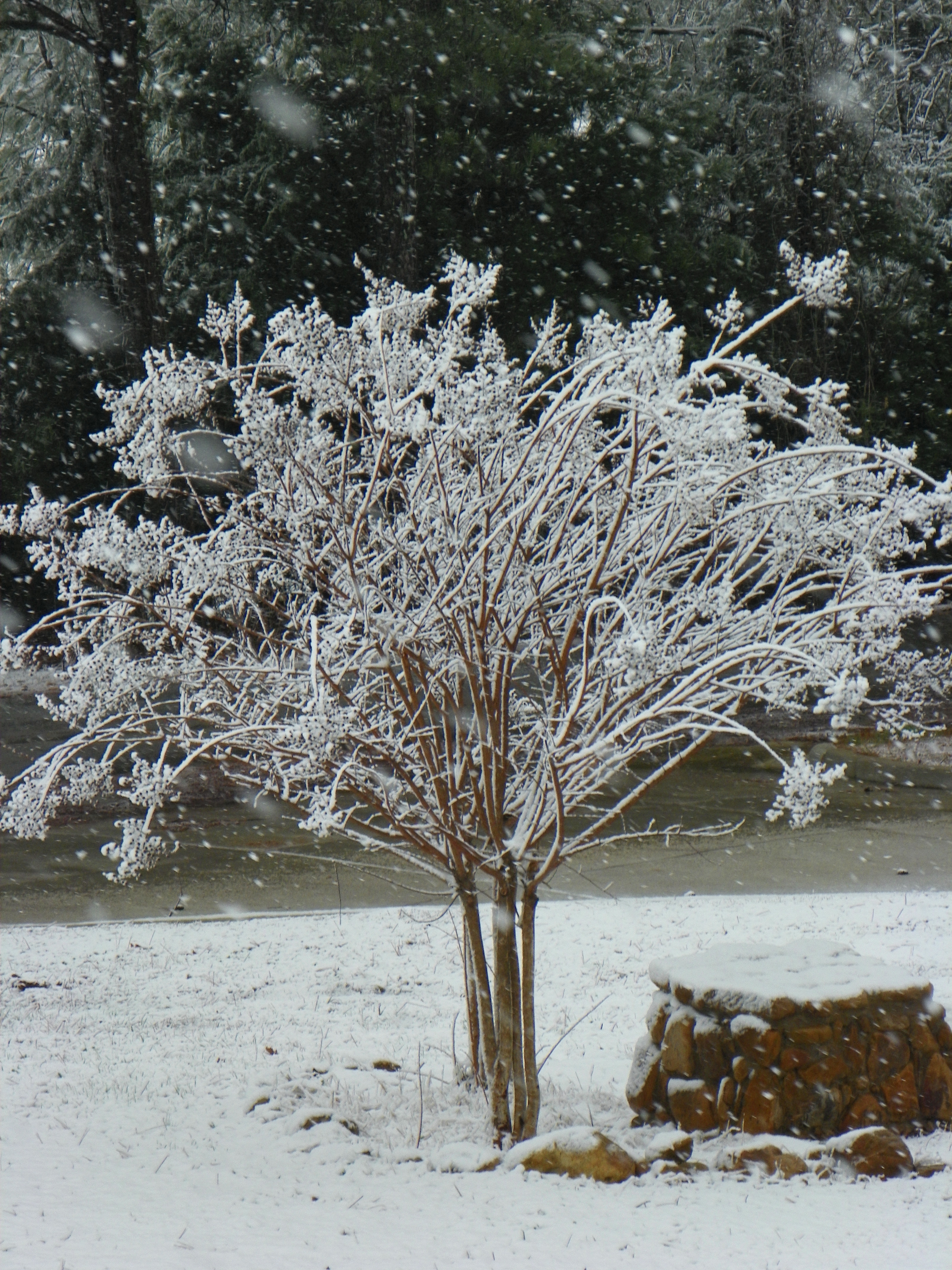 It is rare that we get an accumulation of snow…the schools have already sent everyone home early. Around here if snow is coming everyone runs to the store for bread and milk….and hunkers down for a long winters nap.