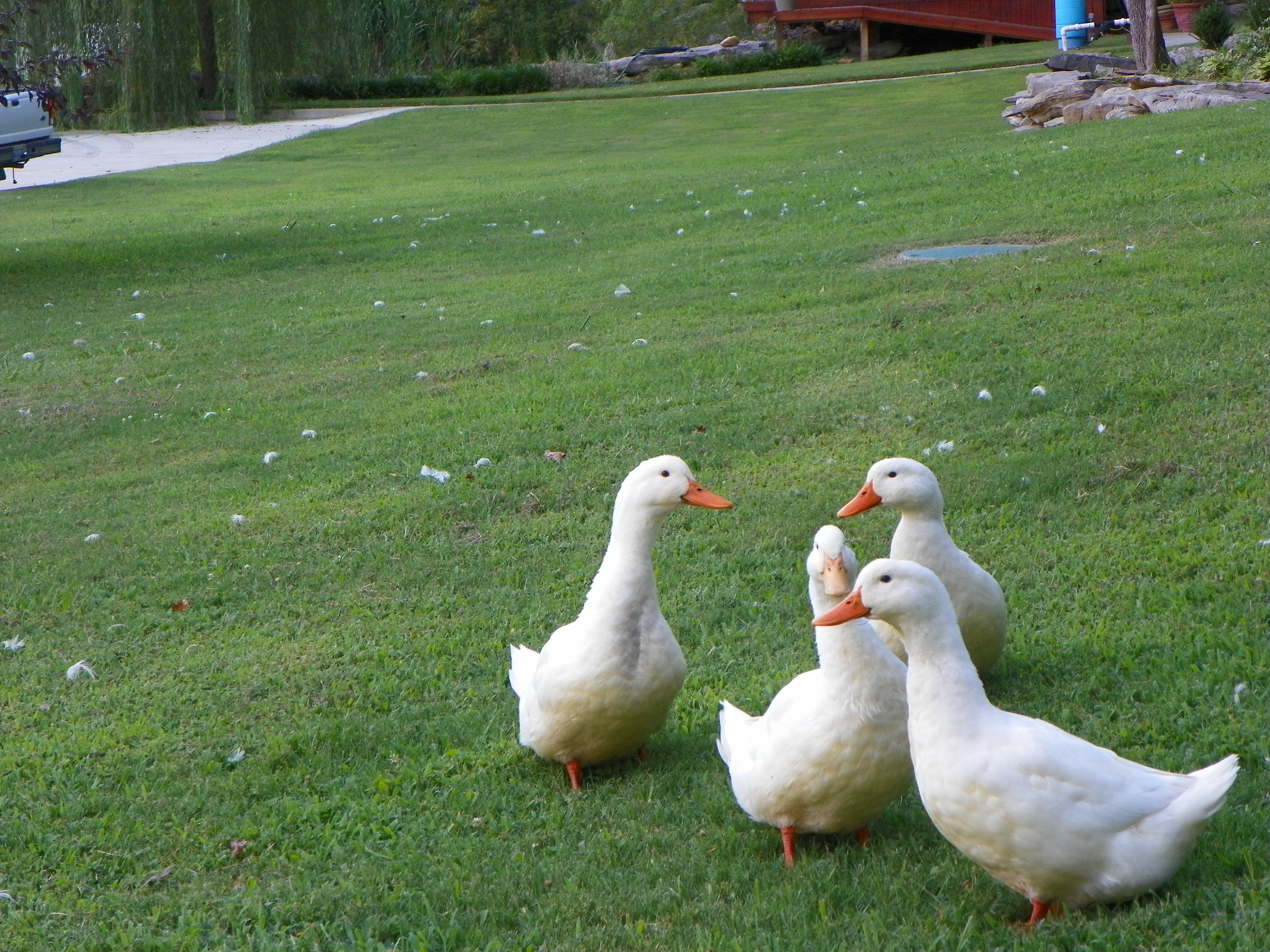 I passed the ducks this morning on my way to the coop. They were resting in our front yard. It looks like there has been a pillow fight in the yard where their downy feathers lay. Yet nothing ever seems to bother them.