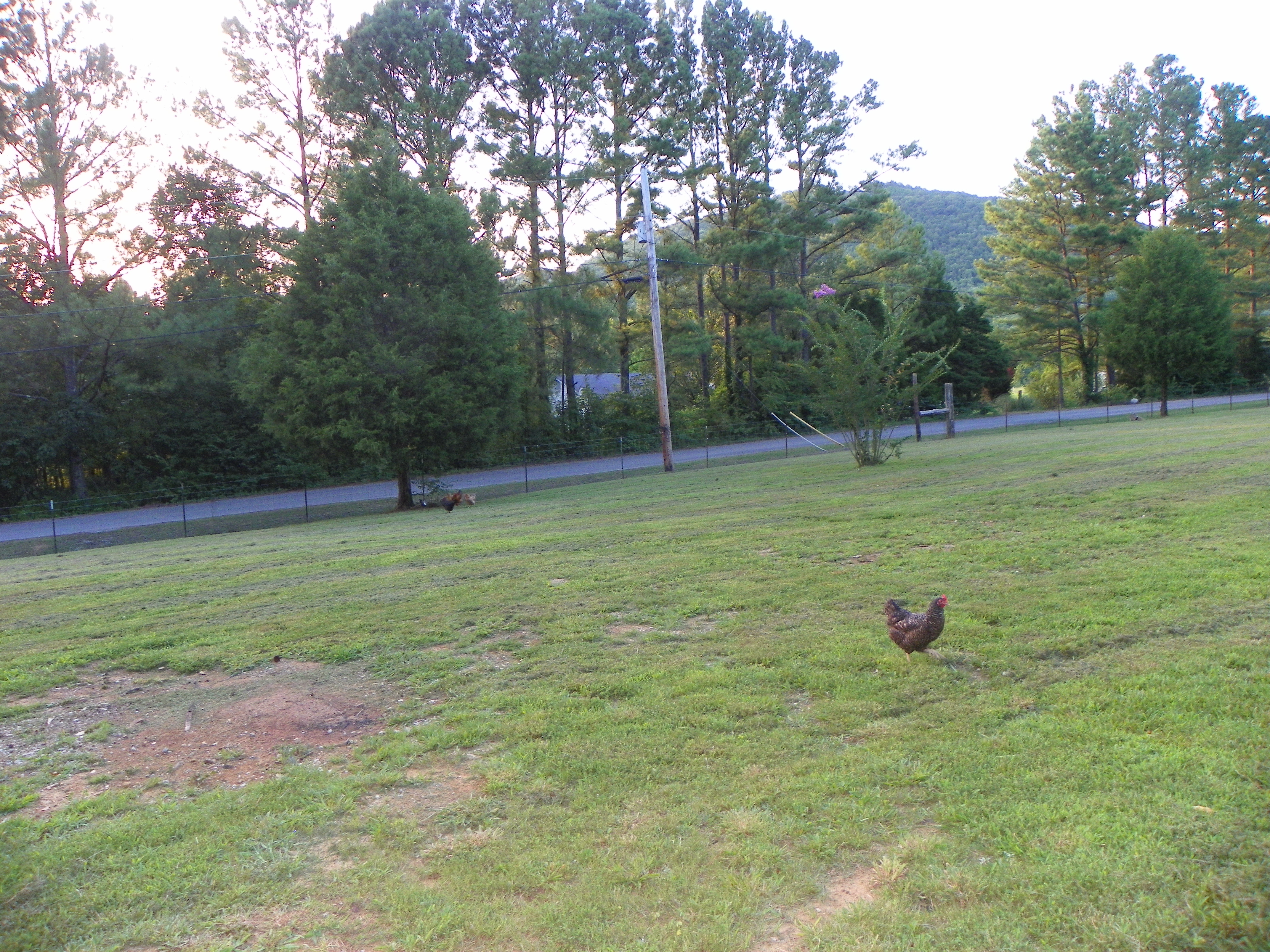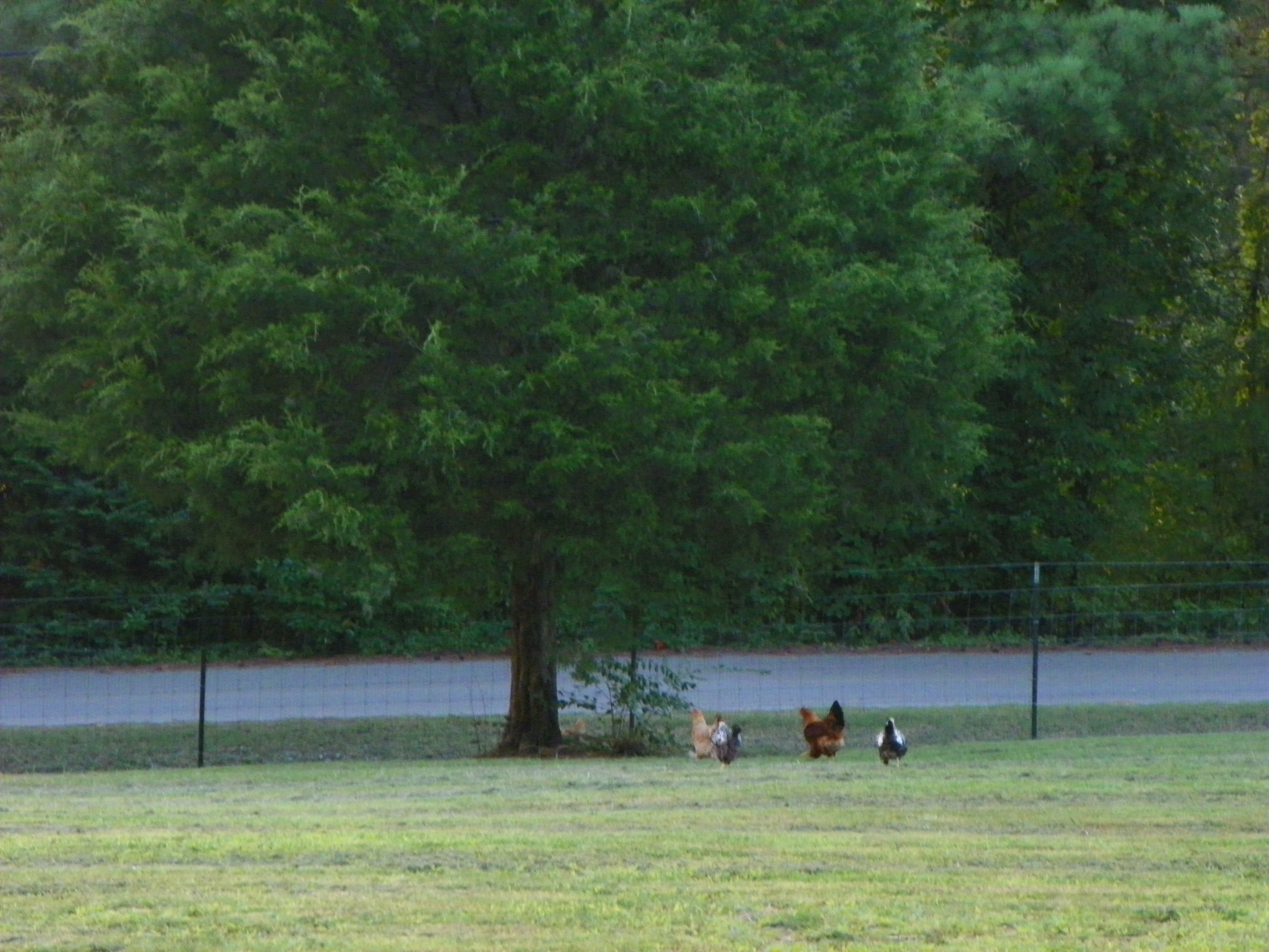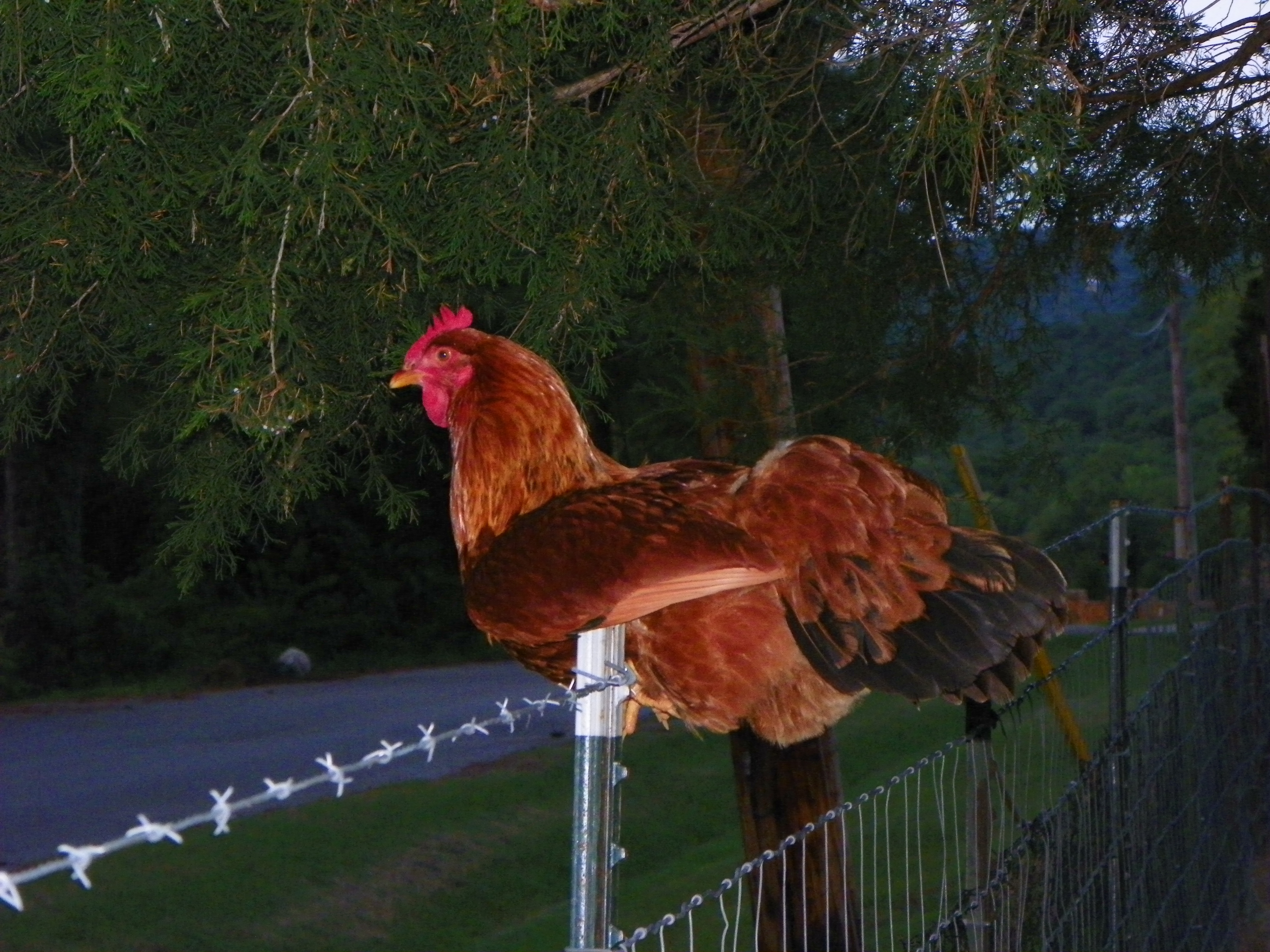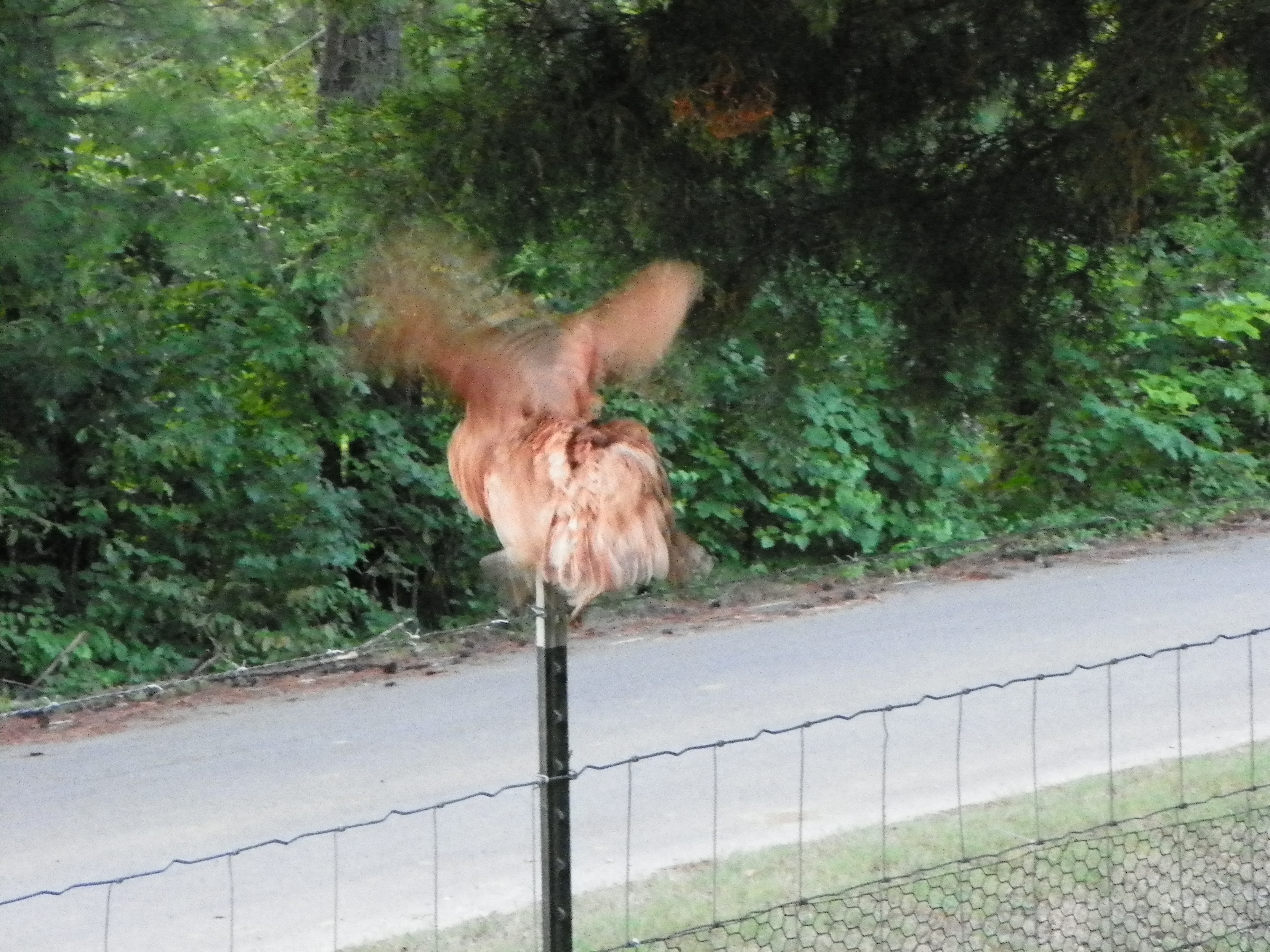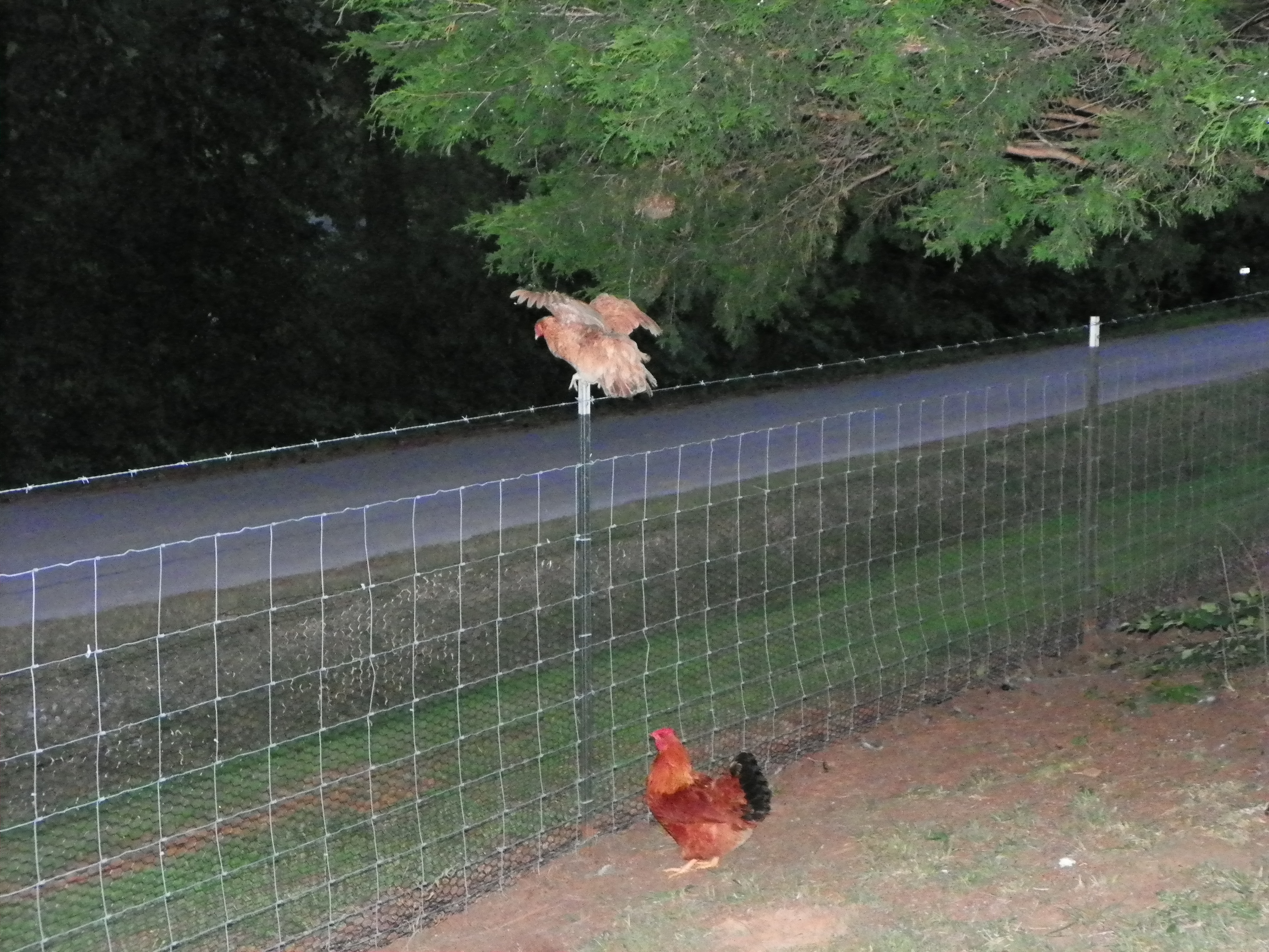 Amy seemed to have the hardest time getting up onto the fence post. I was pretty sure she was going to forego the tree and stay there for the night. I headed to the fishpond to retrieve my net. When I came back…sure enough there she was still sitting on that barbed wire. I tried placing the net over her….but I wasn’t quick enough….down she came. She made all kinds of racket while I chased her all over the yard with my net. I wan’t able to get her….but I did hem her in so she had nowhere to go but inside the coop.
