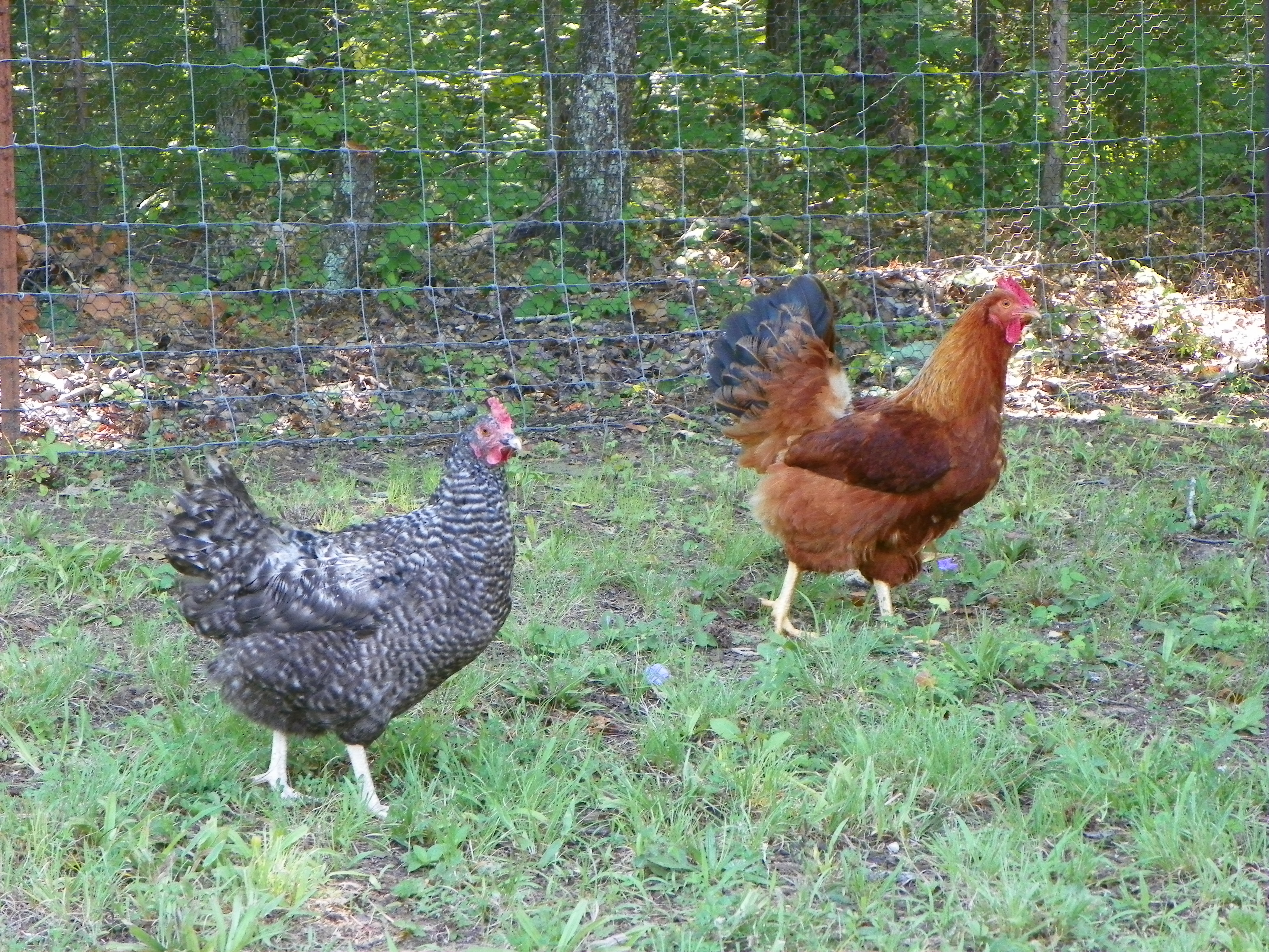 She is on the left…Amy is on the right. Beverly was enjoying having the whole coop to herself. She would retire at dusk and settle into the coop just fine. Amy on the other hand is a little cranky. She is a beautiful hen…but she is bossy. She is also a little on the heavy side. She wanted to go with the rest of the girls and hang out in the tree all night. But she was just too “heavy” to get into the tree. She was always the last one to arrive on the fence….but couldn’t seem to make it the rest of the way up into the tree. She spent two different nights balancing on the barb wire fence, refusing to give up and go in the coop on her own.