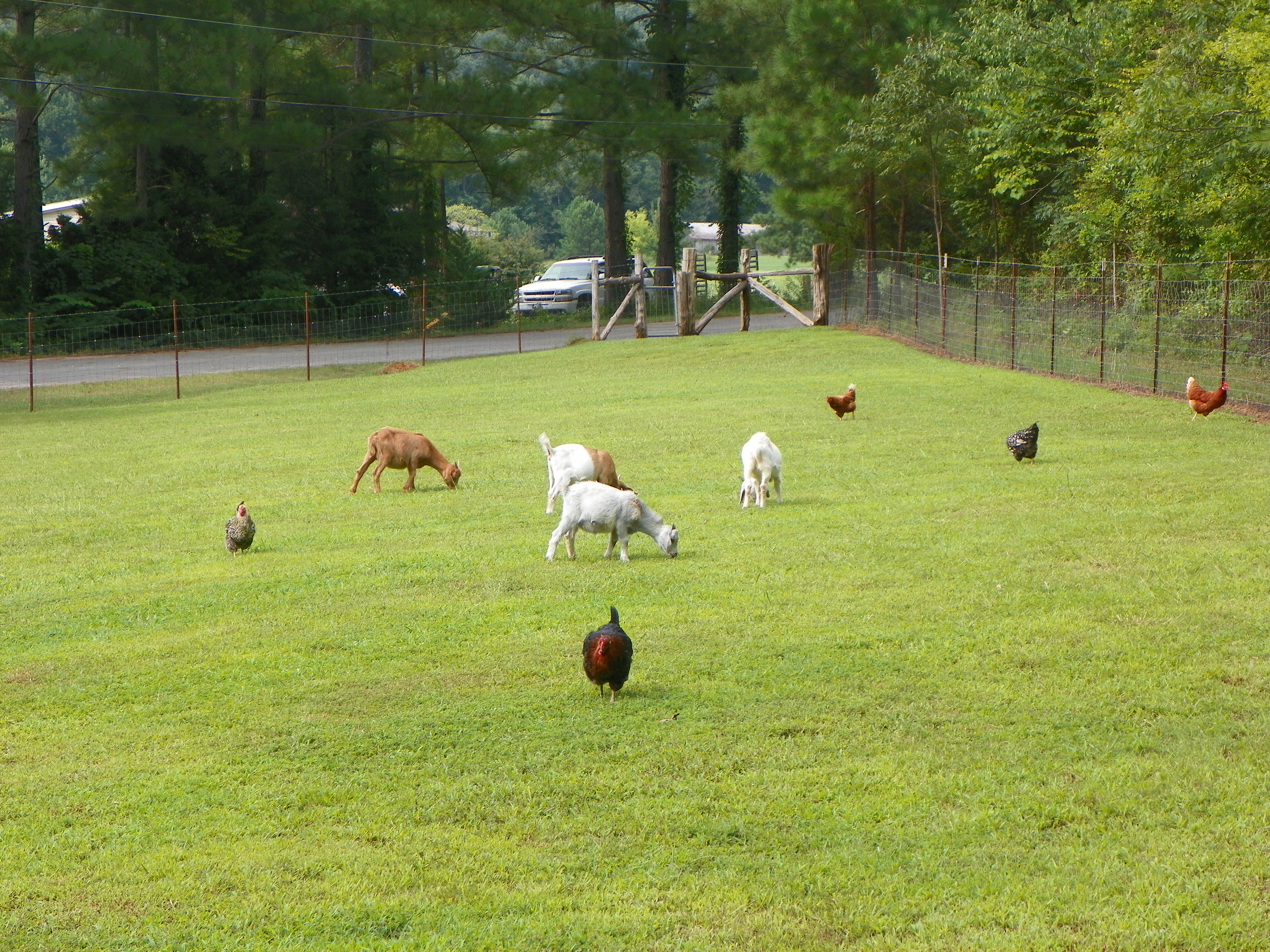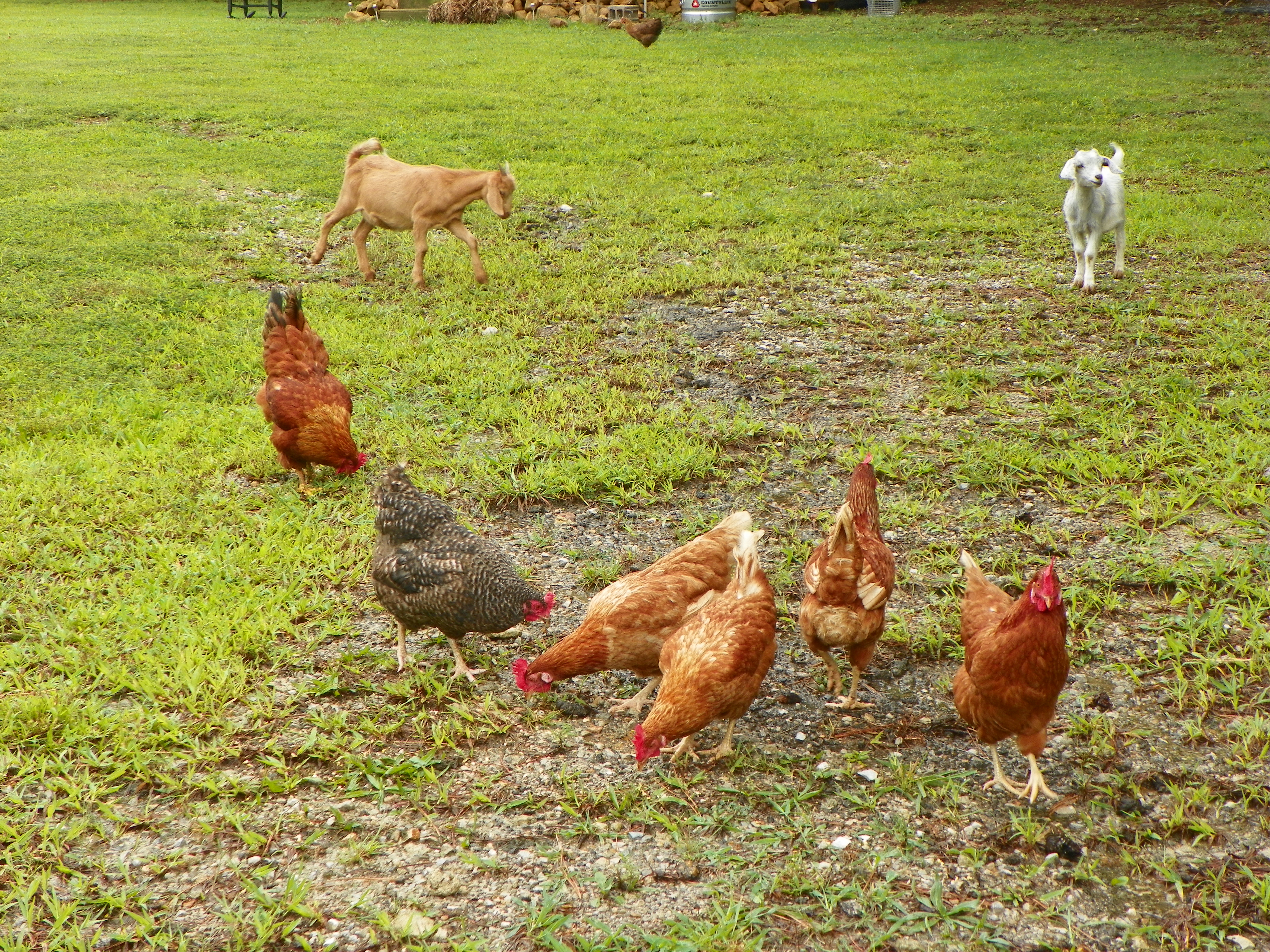 They are mingling with the others well. The others are actually starting to warm up to Billy and I more. Those are the ones we bought in the Spring and they still keep their distance. They are starting to run to the fence when I come in….and follow behind me to the hen house. Curious to see what I am doing.