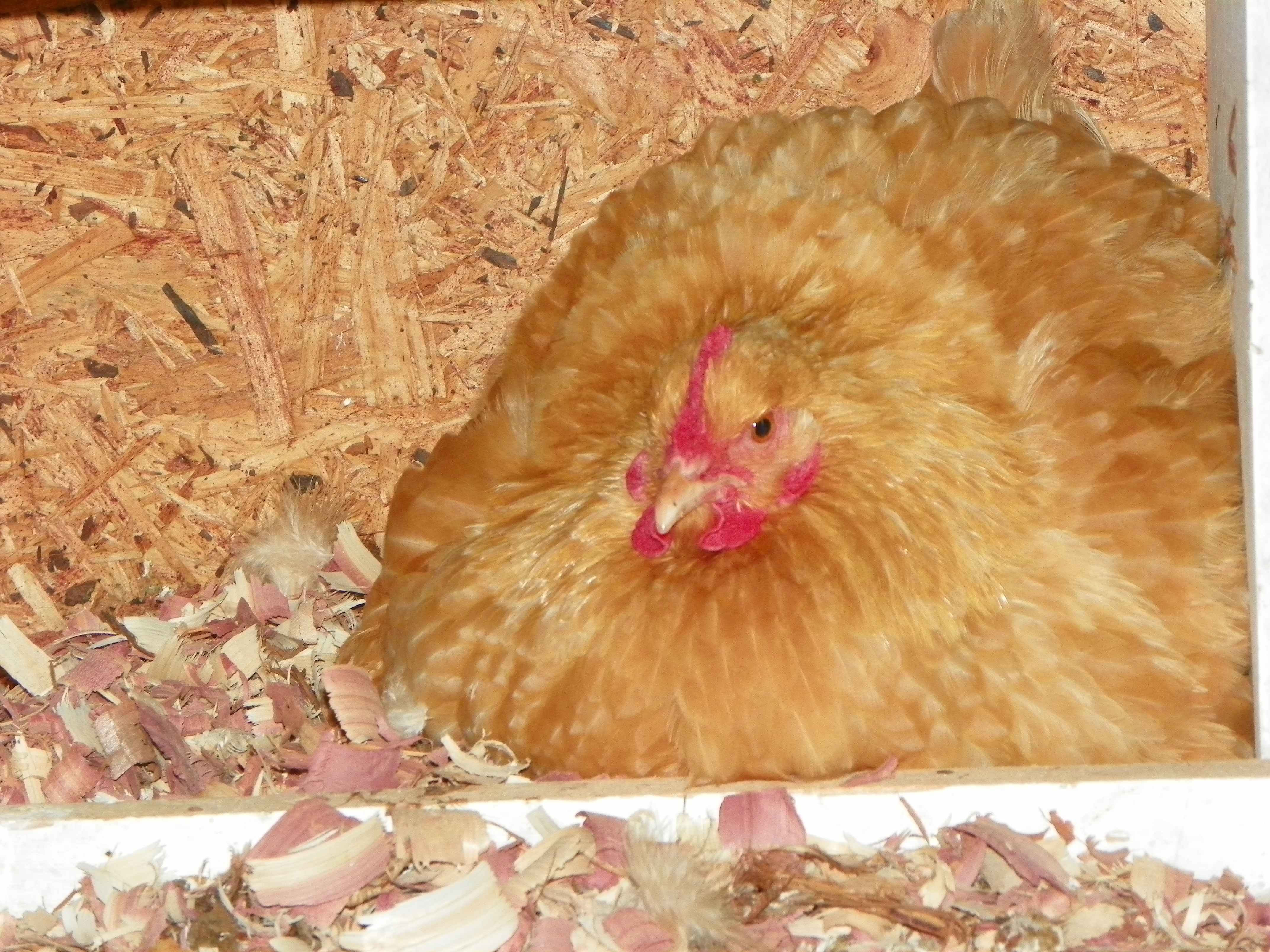 Two days later…..I went to feed everyone. I noticed Maggie Mae was rearranging things….she was standing over the eggs…. on the board in front of the nesting box.