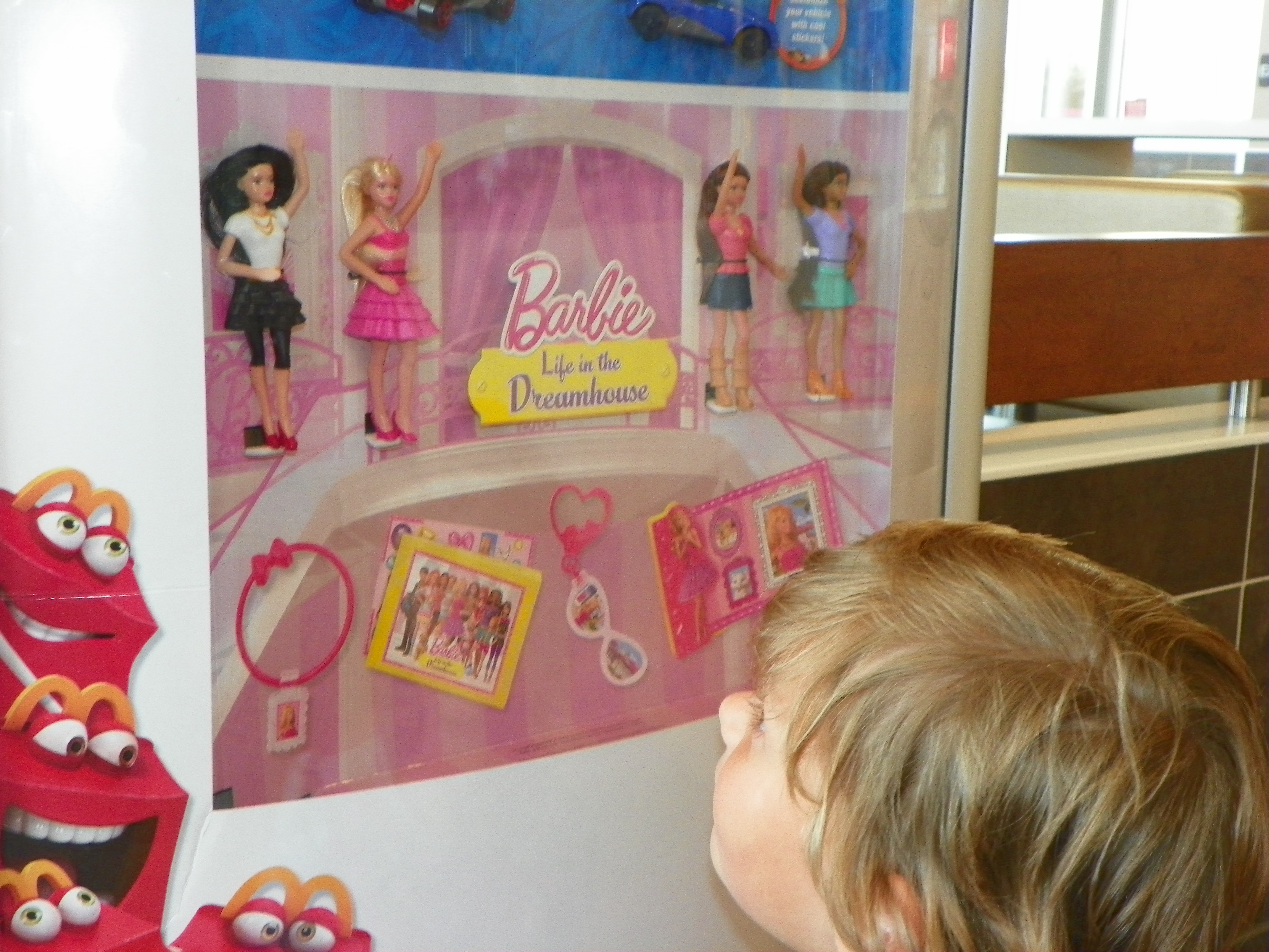 The boys were making their famous sign for being crazy as they watch Vika drool over the Barbies in the display case.