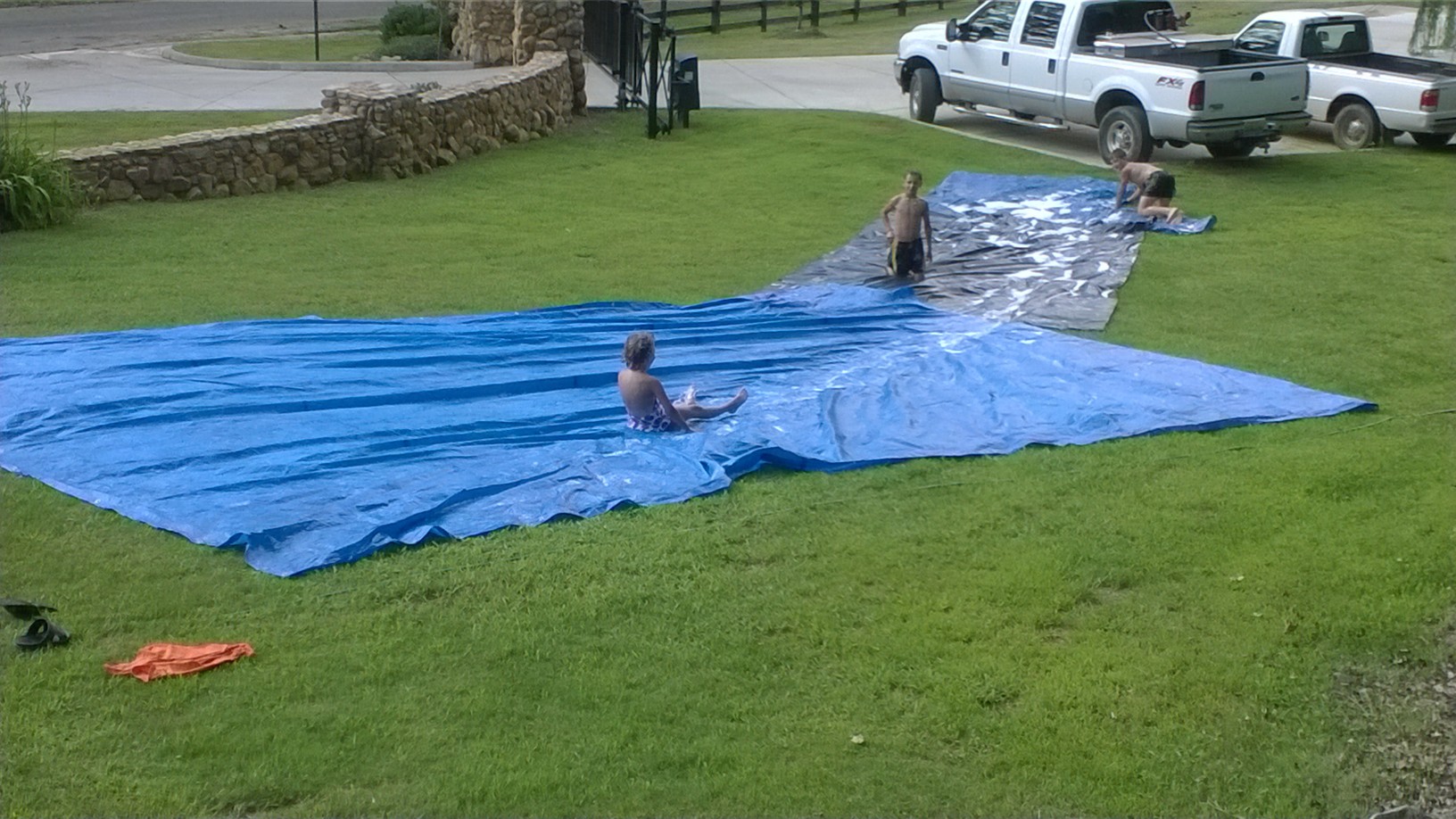 And one day I noticed Billy gathering tarps from the garage. The next thing I know the kids were running in the house to put on bathing suits. Seems Billy had made a home made slip and slide.