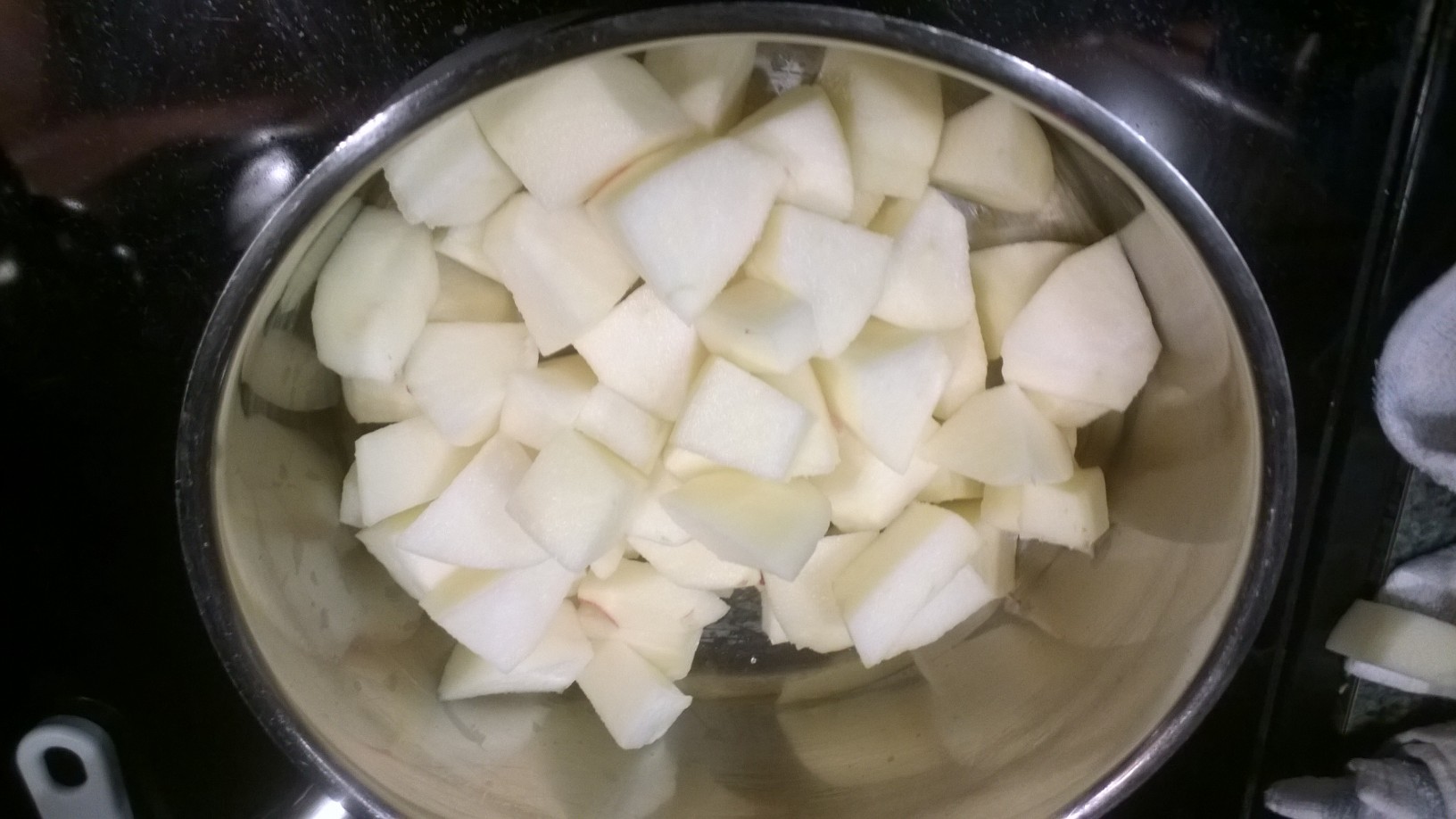 I peel the apples and cut them into uniform bite size pieces. It doesn’t really matter what size, but you do need to keep them close to the same size so they cook evenly.