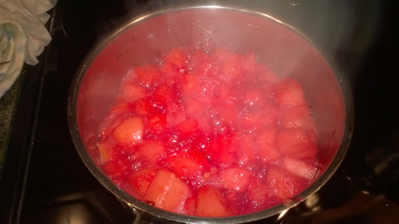 Sprinkle a few red hots in the pot with the apples. On this day I only used about 1/3 of the bag because I didn’t have many apples. When I cook a pot full of apples 6 to 8 or so, I use the whole bag of cinnamon candy.