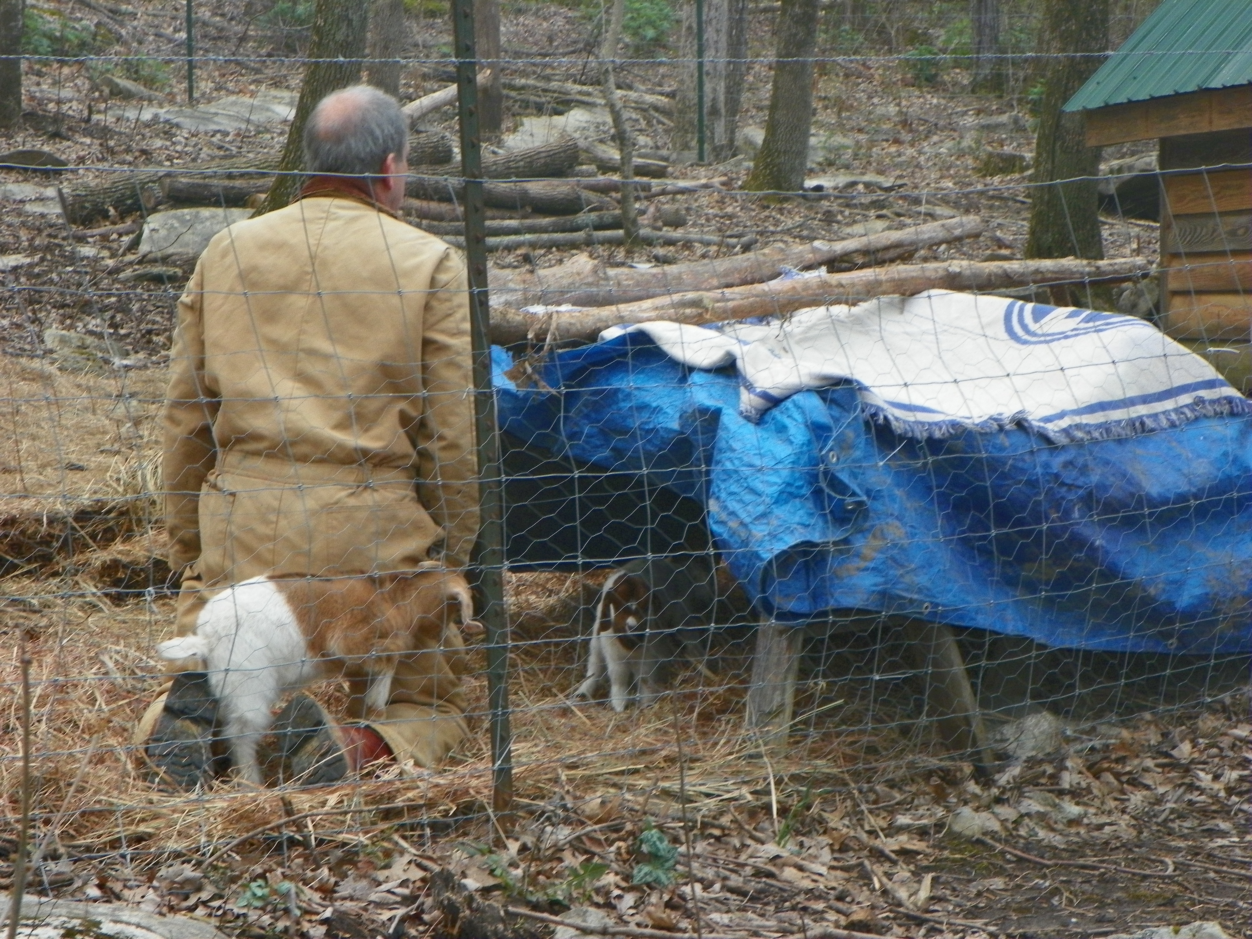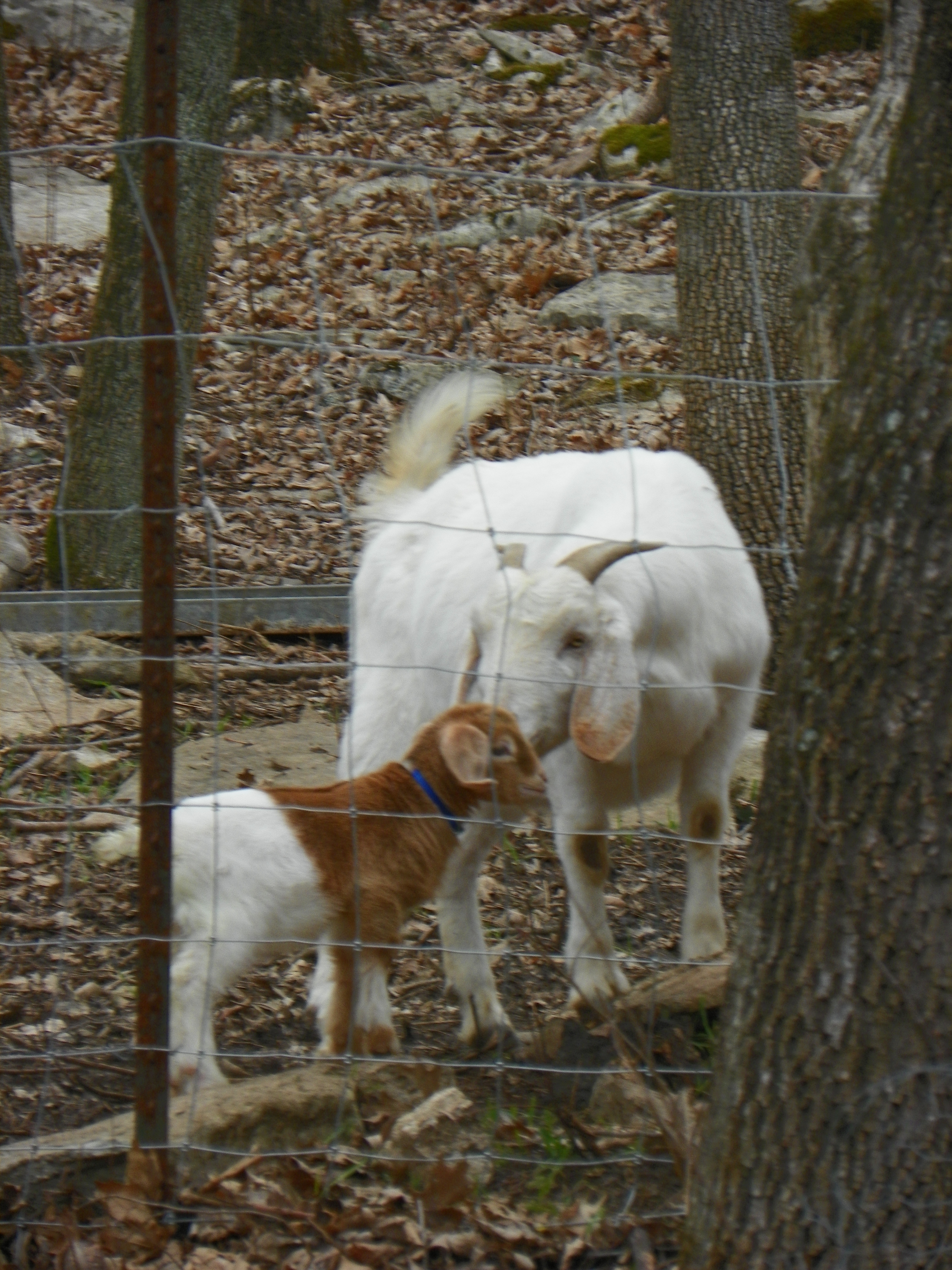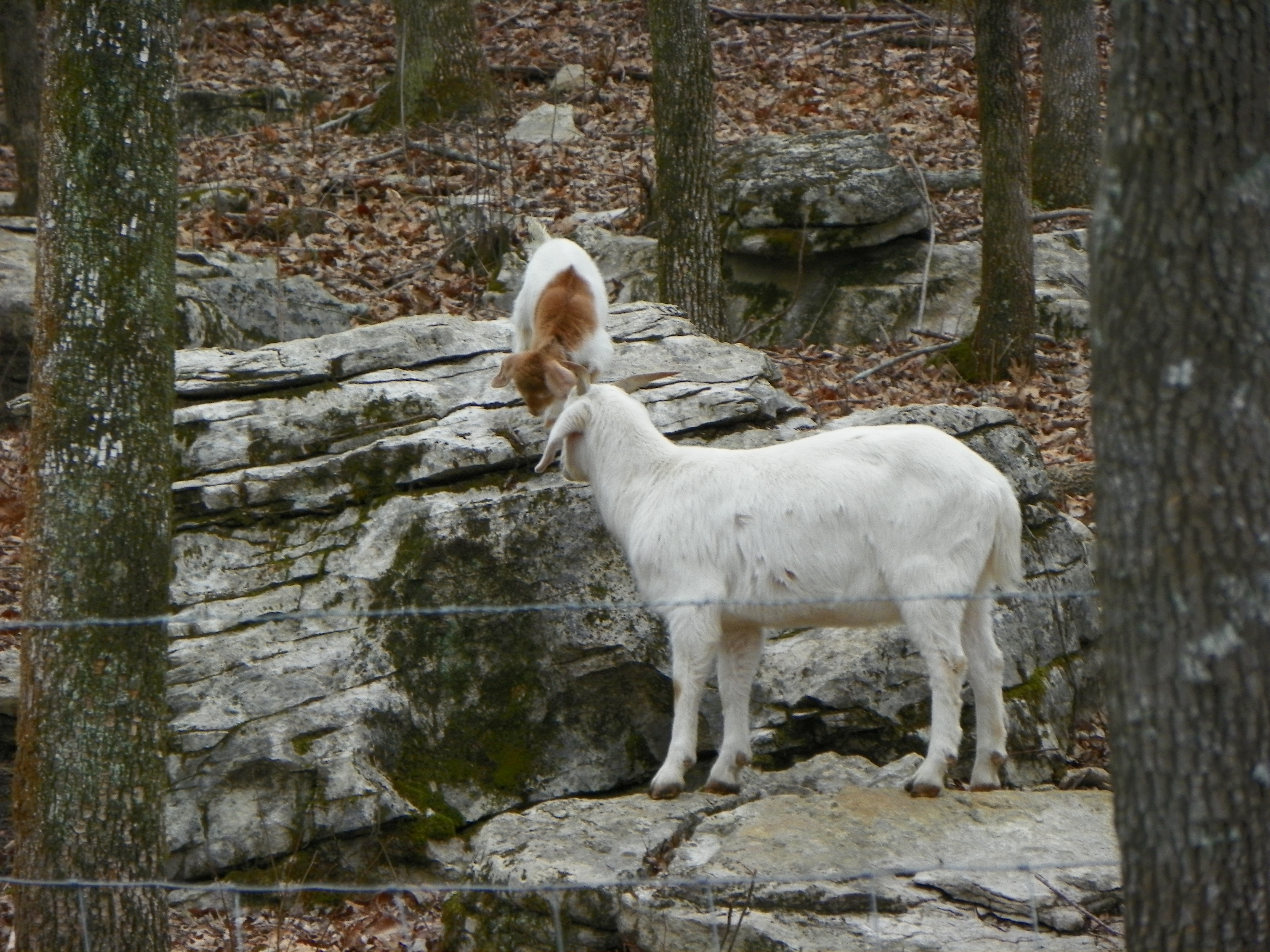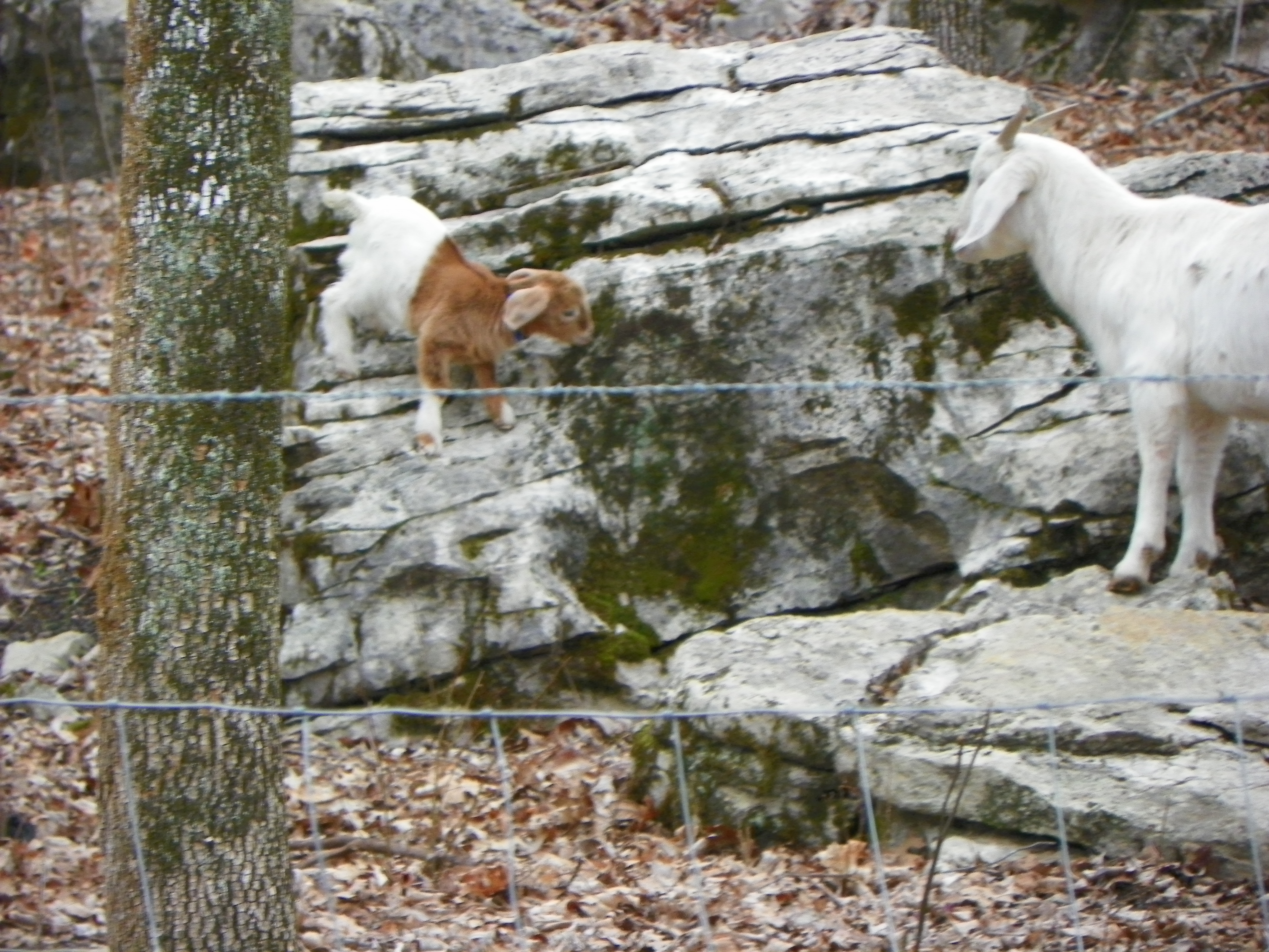 I finally spotted them on the other side of the fence in the wooded area….in two different trees. Billy was able to reach Maggie Mae, although she protested greatly, he placed her in the coop. Mara was beyond his reach.